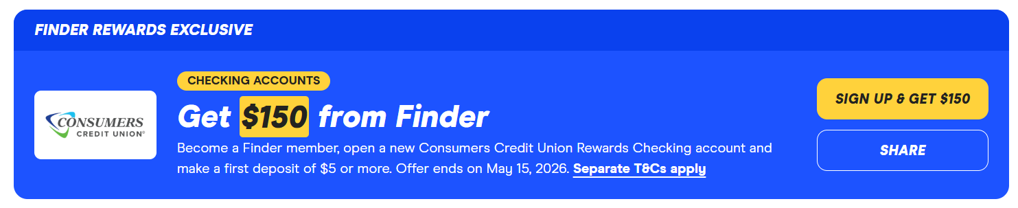 - Finder is offering a $150 digital gift card when you open a new Consumers Credit Union Rewards checking account and meet the following requirements: