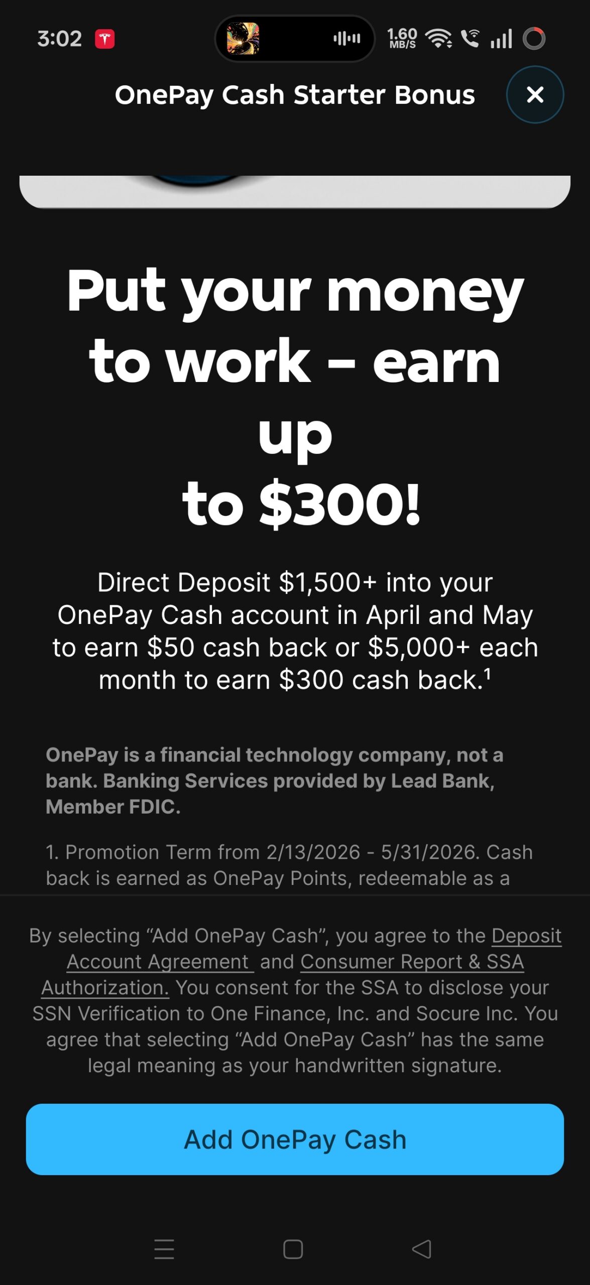 Update 11/30/25: Offer is back and slightly higher at $180/18,000 for opening a OnePay Cash account and making three direct deposits of $500+. (Not as good as the prior $250, but it hasn’t been that high in a while.) Also get 10% cash back at Walmart from OnePay on your first Walmart purchase made within your first month, on up to $200 spent. Might be possible to stack this with a $50 referral signup bonus. (Check out this post about the OnePay debit card.) (The old $300 direct deposit bonus is no longer available.)